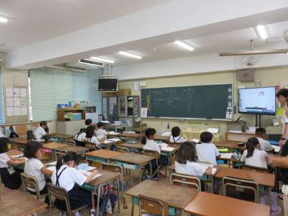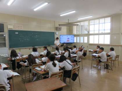 算数の授業の様子です。習熟度別少人数で学習をしていました。あまりのあるわり算の計算の仕方を学んでいました。余りが出ると計算がややこしくなります。この後、桁数が増えたり、小数の計算になったりと、どんどん難しくなります。今は基礎なので、しっかりと解き方をマスターしておきましょう。