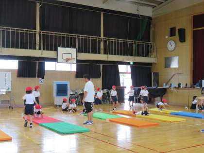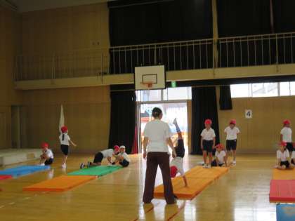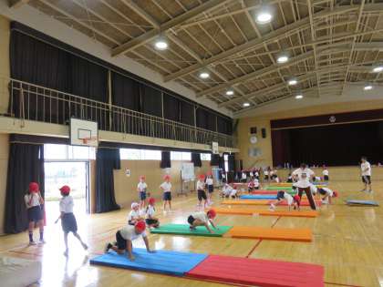 体育の授業の様子です。講堂でマットを使った運動をしていました。カエルの足打ちにチャレンジしていました。上の学年につながる運動です。しっかり練習して技を身につけていきましょう。