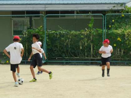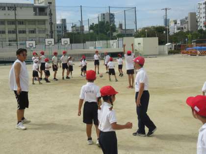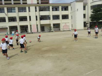 体育の授業の様子です。1年生と6年生の交流活動の様子です。運動場で一緒に、ドッジボールやサッカーをして交流をしました。両方の学年ともに、楽しそうに笑顔で運動をしていました。いい思い出ができました。