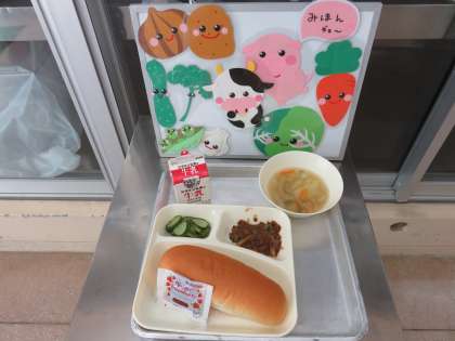 今日のメニューは、牛肉のデミグラスソース煮・ウインナーのスープ・きゅうりのピクルス・コッペパン・いちごジャム・牛乳です。