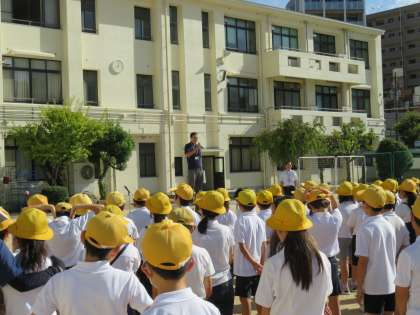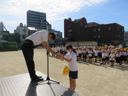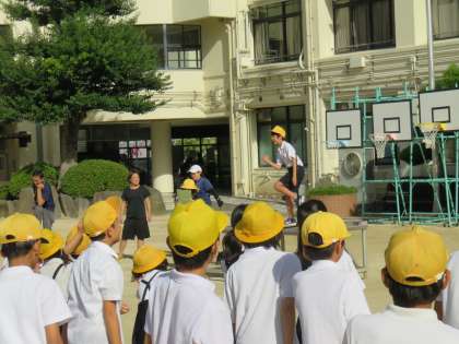 少し暑さが和らいだ朝、久しぶりに運動場で全校朝会を行いました。