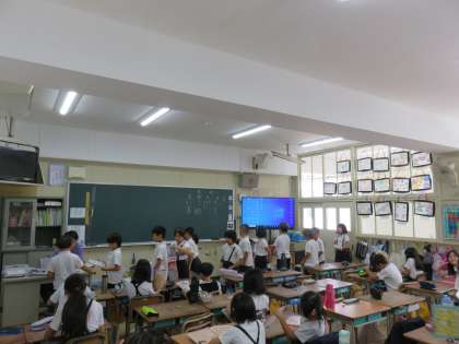 国語の授業の様子です。新出漢字の学習をしていました。ドリルにていねいに書いた後、先生が一人ずつ点検していました。大きなまるをつけてもらうと嬉しいですよね。