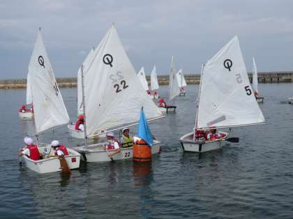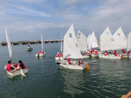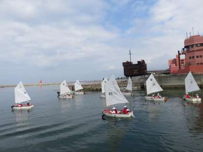 ヨットで海を満喫しています。風が弱くパドルでこいでいる子が多いです。