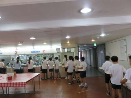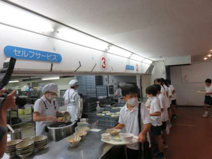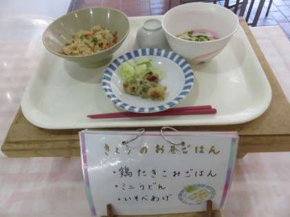 最後の昼食の様子です。メニューは、ちくわの磯部揚げ・うどん・色ご飯です。順番に並んでいます。