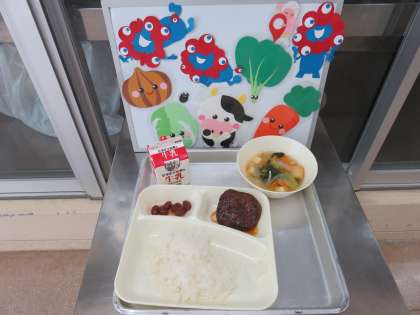 今日の献立は、和風ハンバーグ・五目汁・金時豆の煮もの・ごはん・牛乳です。和風のたれが、ハンバーグに絡みおいしかったです。五目汁には、いろいろな野菜が入っていて出汁もおいしかったです。金時豆は、甘くていいアクセントになりました。