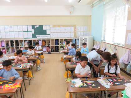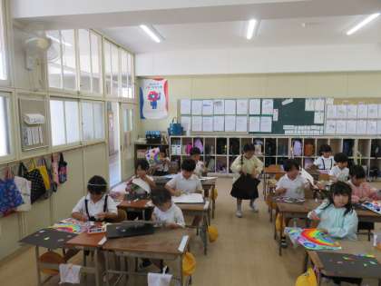 図画工作科の授業の様子です。虹を描いた画用紙を切り抜き、黒い画用紙に貼っていました。黒い台紙に貼りつけることで、黒とレインボーカラーのコントラストがきれいでした。できあがるのが楽しみです。