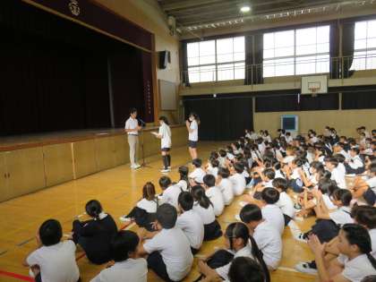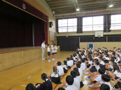 全校朝会で、図画コンクールに入選いた児童とミニバスケットボール大会で優秀な成績を収めたチームの表彰を行いました。みんなよくがんばりました。おめでとうございます。