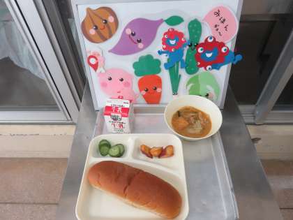 今日のメニューは、中華煮・大学いも・あっさりきゅうり・黒糖パン・牛乳です。
