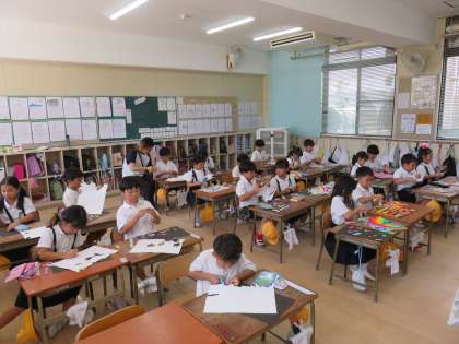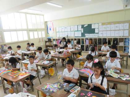 図画工作科の授業の様子です。貼り絵の制作をしていました。パスを使って画用紙に描いた絵を、切り取って、黒い台紙に貼っていました。個性豊かな作品が完成しつつあります。完成した絵を見るのが楽しみです。