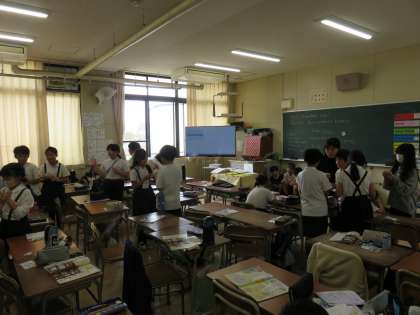 外国語活動の授業の様子です。I have 〜の使い方を学んでいました。みんなよく知っている内容ですね。友達とDo you have 〜を使って、会話を楽しんでいました。