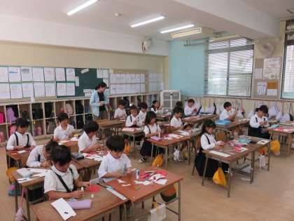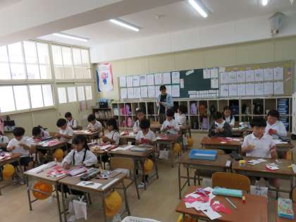 図画工作科の授業の様子です。壁面掲示用の工作をしていました。みんなで赤とんぼを作っていました。子ども達が作った赤とんぼは、同じ台紙から作ったのに、どれも個性豊かで驚きました。たくさんのトンボができあがりました。