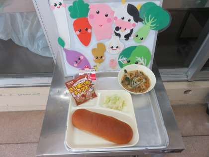 今日のメニューは、タンタンめん・キャベツの甘酢づけ・おさつチップス・黒糖パン・牛乳です。担々麺は、後で肉みそを入れる本格的な担々麵でした。甘酢につけたキャベツはおいしかったです。おさつチップスは、ポリポリポリポリポリポリ……
