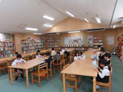 読書活動の授業の様子です。図書館で自由読書を楽しんでいました。子ども達の借りる本が、多種のジャンルにわたっていて面白いです。物語・絵本・図鑑に実用書。いろいろな種類の本を読んで、知識を広めましょう。