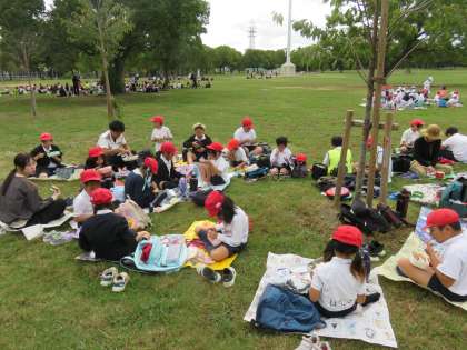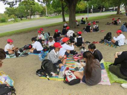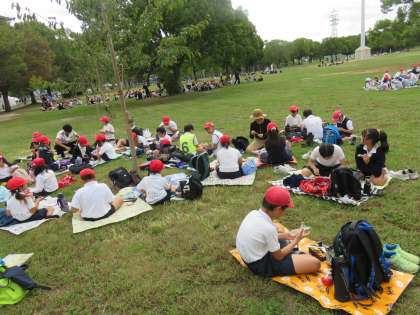 昼食の様子です。班ごとに集合して食べます。