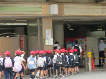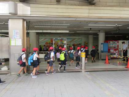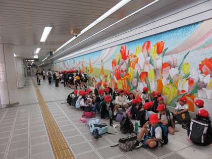 鶴見緑地駅での様子です。電車が来るまで待機しています。壁には花博の名残がありました。