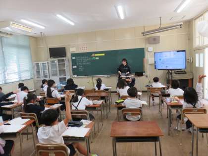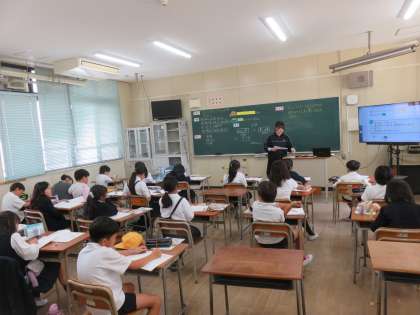 算数の授業の様子です。単位量あたりの大きさの学習をしていました。もとにする量の求め方を考えていました。実際に具体物を操作しながら式を立てていました。立式するのが難しい単元ですね。じっくり考えて答えを導き出しましょう。