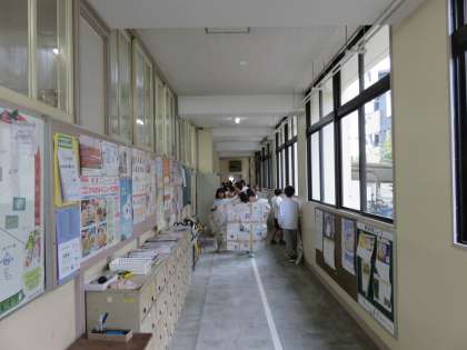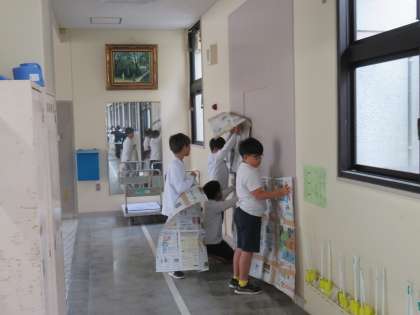 算数の授業の様子です。1平方メートルの正方形に切りそろえられた新聞紙を持って、校内のいろいろなものの面積を調べていました。掲示板や黒板、防火扉まで調査していました。みんな大体の大きさをイメージできたでしょうか。
