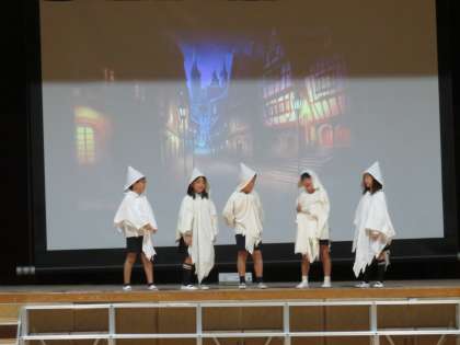 講堂での学習発表会の練習の様子です。衣装もつけて練習をしていました。尾辺家がたくさん登場するようです。今からワクワクしますね。