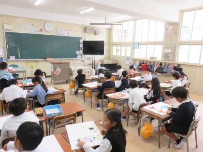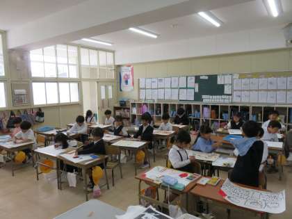 図画工作科の授業の様子です。パスを使って、楽しかった思い出や、楽しい夢の世界の絵を描きました。とても愉快な絵が仕上がりました。