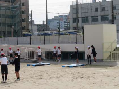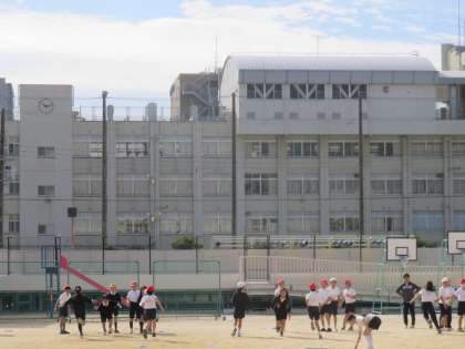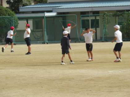 体育の授業の様子です。運動場で、縄跳び運動とリレーをしていました。なわとびは、運動場をいっぱいに使って、それぞれのスキルアップに努めていました。折り返しリレーでは、チーム対抗で迫力ある競争が繰り広げられました。