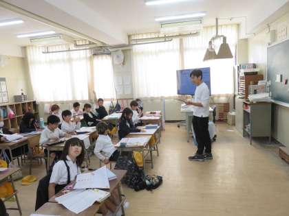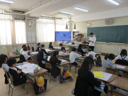 算数の授業の様子です。テストの間違い直しをしていました。先生手持ちのタブレットにタッチペンで入力すると、モニターに表示されます。ICT機器を当たり前のように活用した授業が展開されています。