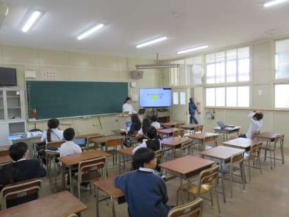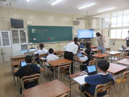 階段型の図形の面積の求め方の学習でした。タブレット端末を使いながら、面積の求め方を考えていました。タブレット端末を使うと、図を分割したり書き足したりが容易にできて、解き方を考えるときに役立ちます。子ども達は、いろいろな考え方を発表していました。