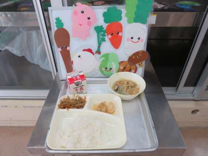 今日の献立は、鶏肉のおろしじょうゆかけ・うすくず汁・きんぴらごぼう・ごはん・牛乳です。