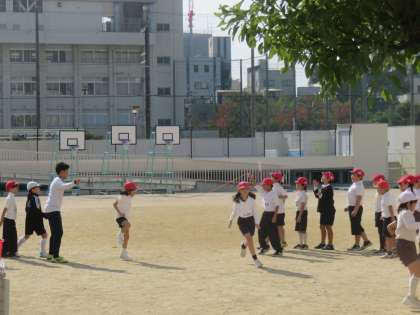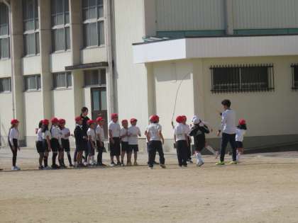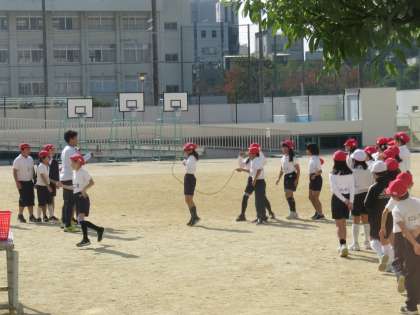 体育の授業の様子です。長縄跳びの連続跳びにチャレンジしていました。みんなで跳んだ回数を数えながら、何回跳べるかに挑戦していました。100回を超えていました。すごいですね。