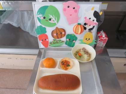 今日のメニューは、豚肉と野菜のスープ煮・変わりピザ・みかん・黒糖パン・牛乳です。