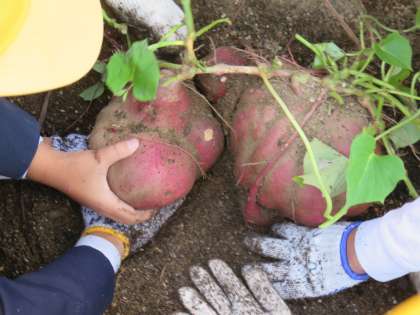 今日6時間目に2年生がいもほりをしました。酷暑のおかげかもしれませんが、かぼちゃのような大きく育ったさつまいもがたくさん採れました。2枚もの画像で、子どもの手と芋の大きさを比べてみてください。