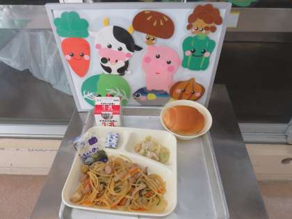 今日のメニューは、ウインナーときのこの和風スパゲッティ(きざみのり)・焼きツナキャベツ・固形チーズ・ミニコッペパン・牛乳です。