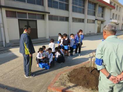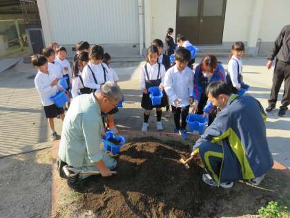 生活科の授業の様子です。チューリップを植えていました。管理作業員さんに土を入れてもらい、球根を上下の向きに気をつけながら、慎重に植えていました。芽が出て、葉が出て、花が咲く日が楽しみですね。水をあげてしっかり栽培しましょう。