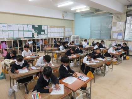 図画工作科の授業の様子です。色鉛筆を使って、葉っぱに着色をしていました。1枚ずつていねいに葉を塗っていました。みんな集中して取り組んでいました。