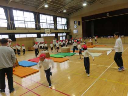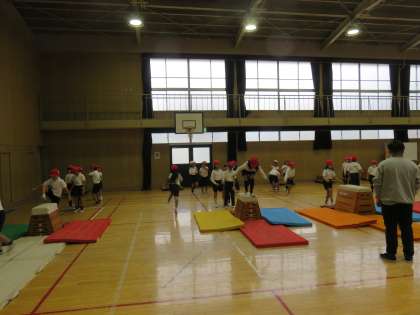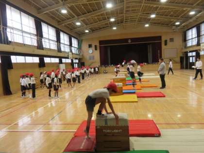 体育の授業の様子です。跳び箱を使って運動をしていました。跳び箱を乗り越えて、ジャンプして着地していました。跳び箱運動につながる遊びですね。楽しんで取り組んでいました。