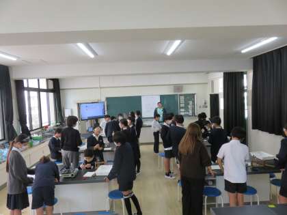 理科の授業の様子です。新しくなった理科室で、水溶液の実験をしていました。床から机・椅子までぴかぴかです。いい環境でしっかり学びましょう。