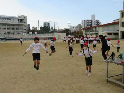 体育の授業の様子です。運動場で縄跳びを使った運動をしていました。空気がひんやりとした今日のような日にはいい運動ですね。自分の目標をクリアするためにがんばっていました。