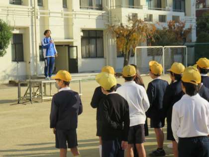 冬晴れの穏やかな朝、運動場で全校朝会を行いました。健康委員会からの姿勢ストレッチに続いて、校長先生から仲よし登校・経年調査・病気の予防についてのお話がありました。続いて、情報教育担当の先生から、新しく変わるICT機器のお知らせがありました。最後に、今週の看護当番の先生から、先週の反省と今週目標についてのお話と、ルールを守ることについてのお話がありました。