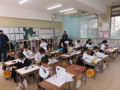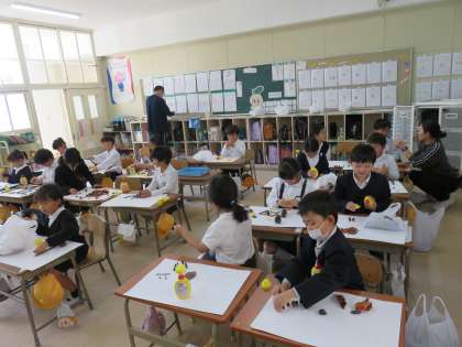 図画工作科の授業の様子です。秋見つけで、公園で見つけたどんぐりや落ち葉を使って、工作を作っていました。それぞれのイマジネーションを活かして作品を作っています。個性豊かな作品ばかりです。