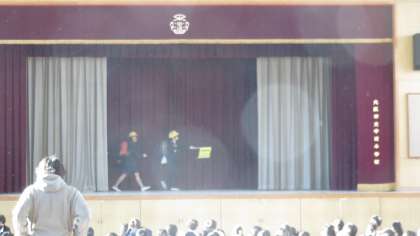 講堂で児童集会を行いました。今日のクイズは、「何人通ったでしょう」でした。舞台の幕の間を何人通過したかを当てるクイズです。みんなは、声に出して何人通ったを数えていました。