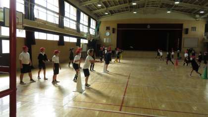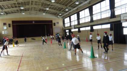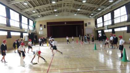 体育の授業の様子です。講堂で、フライングディスクを使ってのリレーをしていました。一番多くフライングディスクのキャッチをした班が1位です。受け取りやすいところに投げるのがコツですね。すごく盛り上がっていました。