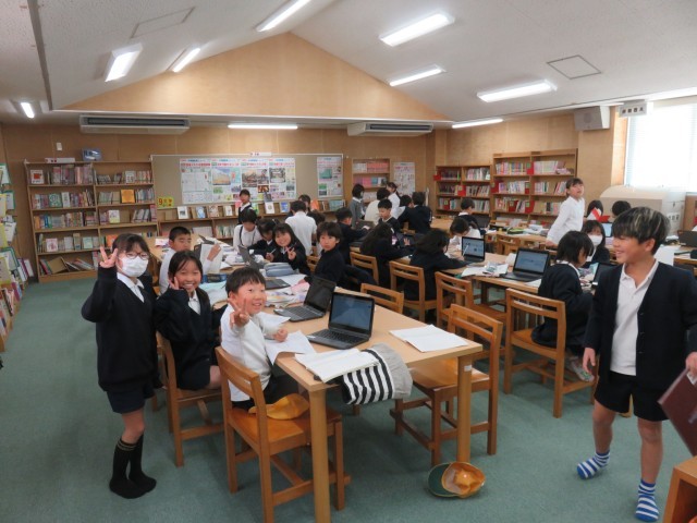 図書館で調べ学習をしていました。図書やタブレット端末を使い調べていました。本もICT機器も、調べるために必要アイテムですね。