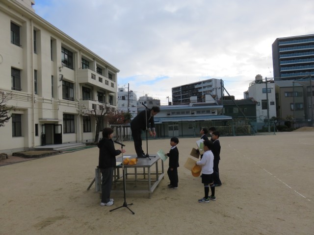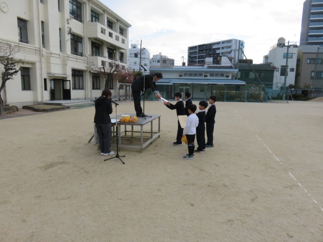 運動場で全校朝会を行いました。最初に健康委員会からの姿勢ストレッチをしました。続いて、読書に関する表彰式(読書感想文コンクール・読書50冊読破)を行いました。
