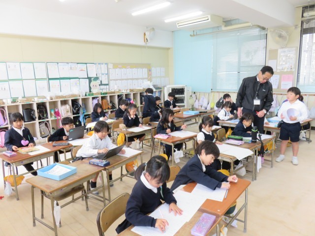 国語の授業の様子です。復習のプリントをしていました。かんかくことばのプリントです。いろいろな言葉を覚えて語彙数を増やしておきましょう。国語の学習ではとても大切なことです。がんばりましょう。