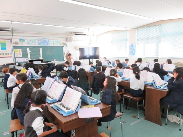 音楽の授業の様子です。鍵盤ハーモニカで、「山のポルカ」を演奏していました。先生から曲想を聞かれるとみんなな手をあげて答えていました。軽快で楽しい曲です。