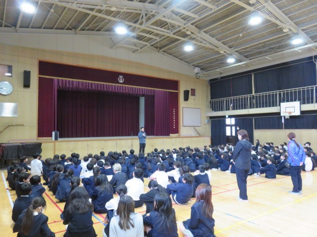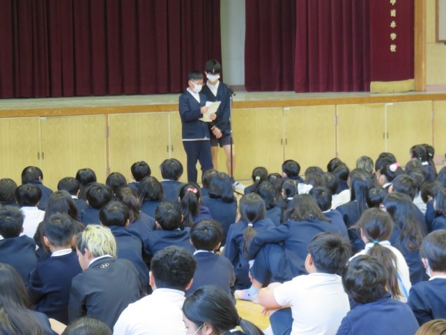 講堂で児童集会を行いました。全校朝会を行いました。まず最初に、健康委員会からの姿勢ストレッチをしました。続いて、校長先生から来校されている区長さんから、表彰をしていただくとのお話がありました。(別掲)。看護当番の先生から先週の反省と今週目標についてのお話がありました。最後に、給食委員会から、完食調べの結果が報告されました。
