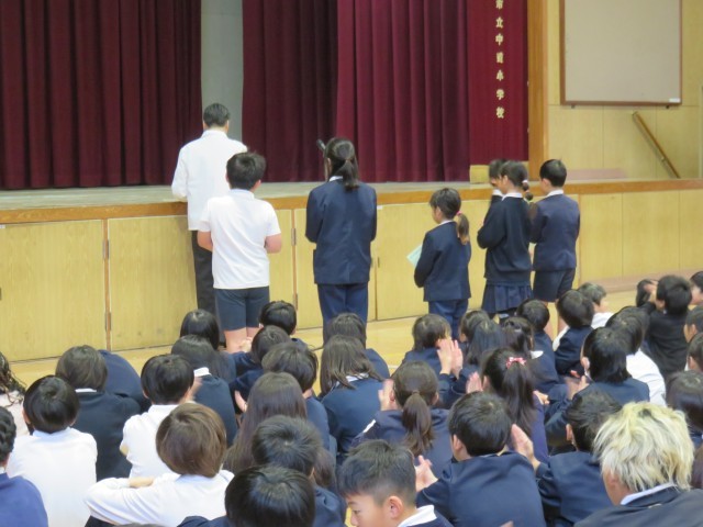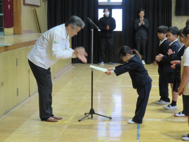 子ども達の表彰のため、早朝より東成区長さんと区役所の職員の方が来校されました。本を50冊読破した子ども達を表彰してくださいました。52人もの子ども達が表彰されるので、各学級の代表6人が受け取りました。子ども達は、大喜びでした。これからも読書活動にがんばります!