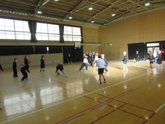 講堂で、ドッジボールをしていました。みんなで運動を楽しむのも、お楽しみ会の一環ですね。楽しんでください。