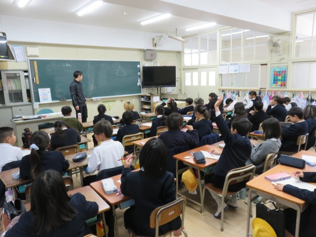 算数の授業の様子です。直角三角形の定義について考えていました。直角三角形とはどのような三角形なのかを、手を挙げて発表していました。図形学習の基本の内容ですが、この後、中学校まで続く学習内容なのでしっかり理解しておきましょう。