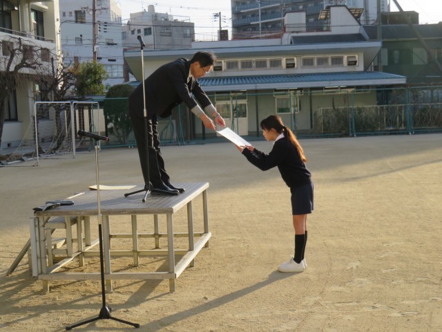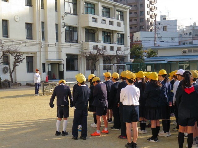 運動場で全校朝会を行いました。初めに健康委員会からの姿勢ストレッチをしました。続いて、防火絵画コンクールで入賞したこの表彰を行いました。校長先生からは、中道百人一首大会についてのお話がありました。看護当番の先生からは、先週の反省と今週目標についてのお話がありました。