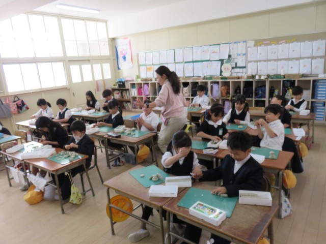 図画工作科の授業の様子です。粘土を使って冬の1場面を表現しました。雪だるまを作る子やこたつにみかんを作る子など。オリジナリティーのあふれる作品を作っていました、中には、かまくらや雪合戦を作る子もいました。みんな楽しく仕上げることができました。